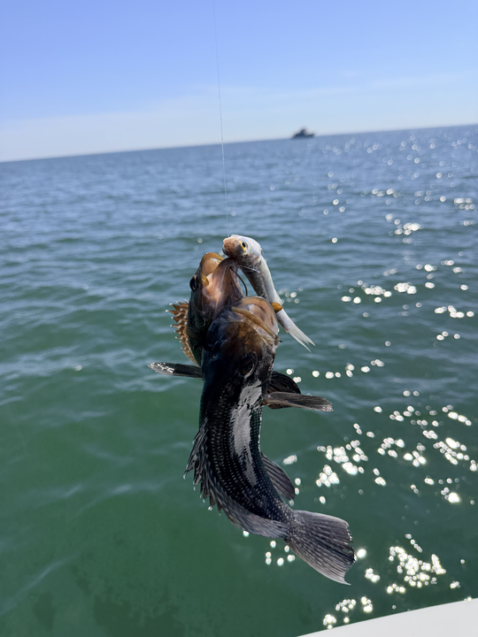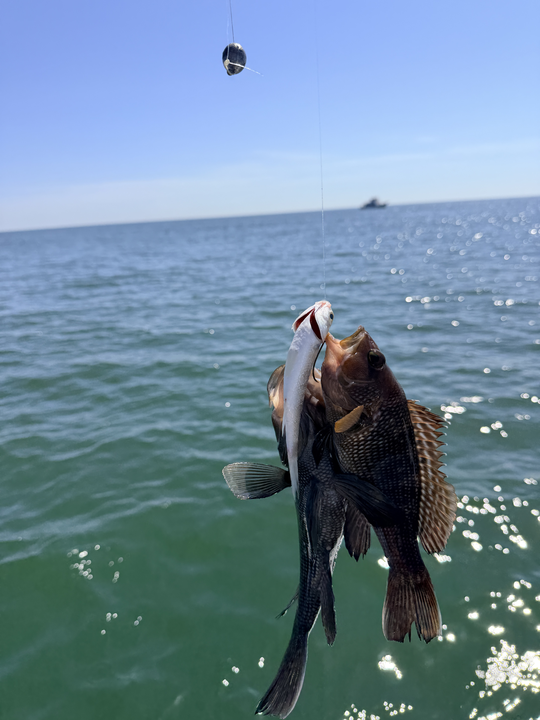 Exciting sea bass action using deep sea jigging! Great day on the water.